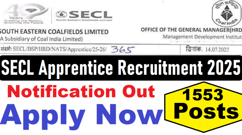 SECL Apprentice Recruitment 2025 : South Eastern Coalfields Limited (SECL) की ओर से 1553 Posts पर Recruitment निकली है जिसका Online form 14/07/2025 से शुरू है | SECL Apprentice Recruitment 2025 Online form 28/07/2025 तक भरा जायेगा | Graduate Pass in various candidates SECL Apprentice Recruitment 2025 online form भर सकता है | Interested and eligible candidates SECL Apprentice Recruitment 2025 form भर सकते हैं |SECL Apprentice Recruitment Full Notification निचे दिया गया हैI SECL Apprentice Recruitment Apply Link निचे दिया गया है I