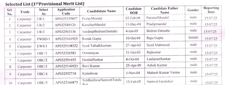 SECR Bilaspur Apprentice Joining Merit list Sample 2025