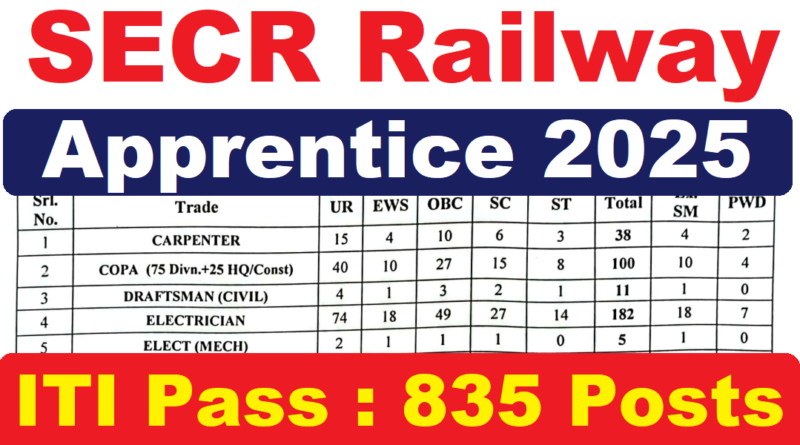 SECR Bilaspur Railway Apprentice Recruitment 2025, 835 Posts, ITI Raiilway Vacancy 2025