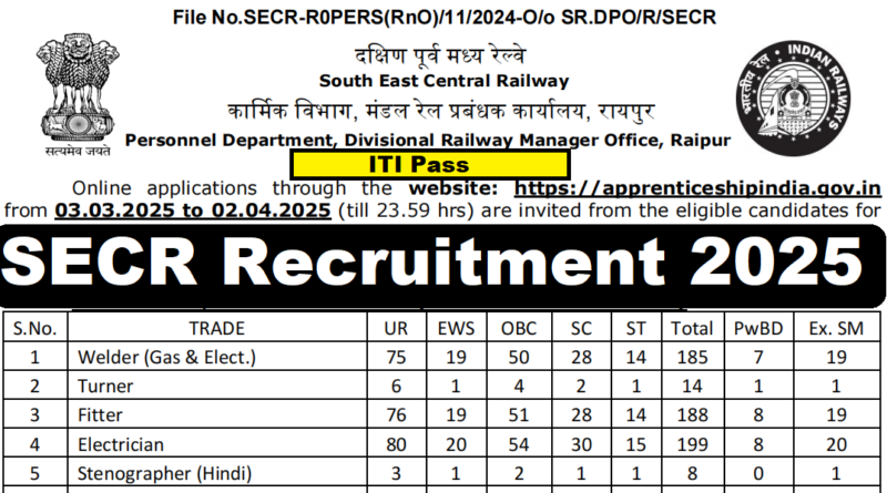 SECR Recruitment 2025 : South East Central Railway (SECR) की ओर से 1003 Posts पर Recruitment निकली है जिसका Online form 03/03/2025 से शुरू है |SECR Recruitment 2025 Online form 02/04/2025 तक भरा जायेगा | ITI Pass in various candidates SECR Recruitment 2025 online form भर सकता है |Interested and eligible candidates SECR Recruitment form भर सकते हैं |SECR Recruitment Full Notification निचे दिया गया हैI SECR Recruitment 2025 Apply Link निचे दिया गया है I