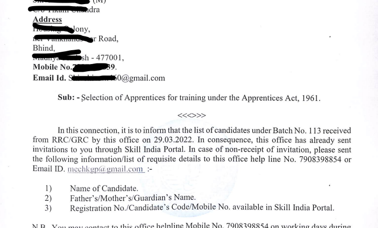 In this connection it is to inform that the list of candidates under batch no 113 received from RRC/GRC by the office on 29.03.2022. In consequence, this office has already sent invitations to you through Skill India Portal. In case of non-receipt of Invitation, please sent the following information/list of requisite details to this office help line no. 7908398854 or Email ID: mechkgp@gmail.com.