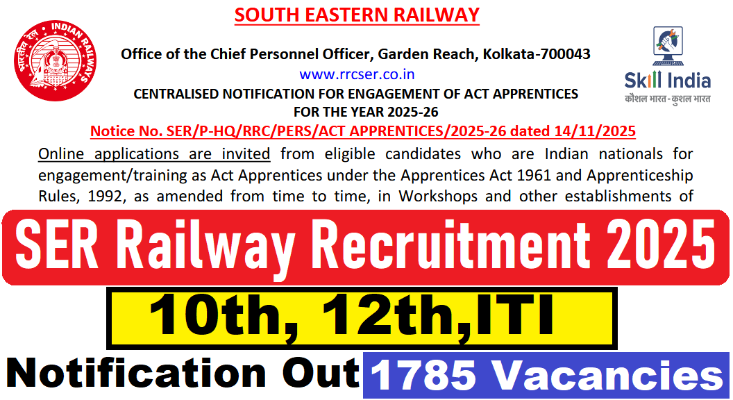 SER Railway Recruitment 2025 : Southern Eastern Railway (SER) की ओर से 1785 Posts पर Recruitment निकली है जिसका Online form 18/11/2025 से शुरू है | SER Railway Recruitment 2025 Online form 17/12/2025 तक भरा जायेगा | 10th, 12th,ITI Pass in various candidates SER Railway Recruitment 2025 online form भर सकता है | Interested and eligible candidates SER Railway Recruitment 2025 form भर सकते हैं |SER Railway Recruitment Full Notification निचे दिया गया हैI SER Railway Recruitment Apply Link निचे दिया गया है I