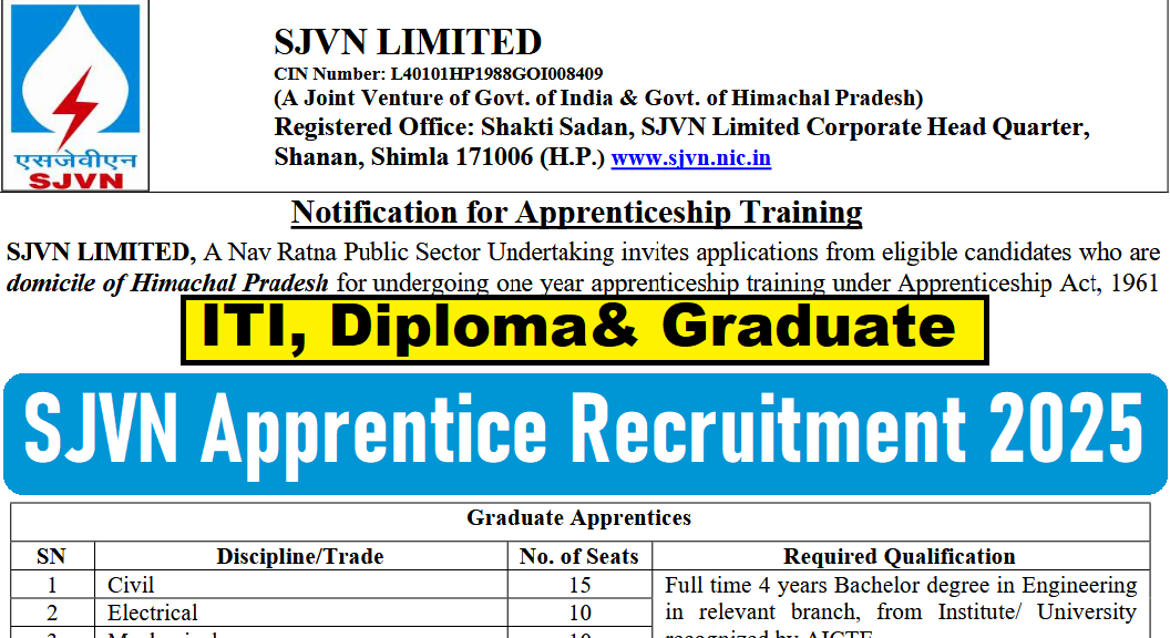 SJVN Apprentice Recruitment 2025, 100 Posts, ITI, Diploma & Graduate Pass Latest Vacancy 2025, 15/01/2026 Last date