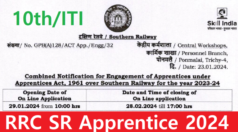 Southern Railway Apprentice Recruitment 2024 : The Railway Recruitment Cell (RRC), Southern Railway (SR), Chennai has released the latest notification for the recruitment of 2860 Apprentices under the various units of the Southern Railway (SR). The RRC SR Apprentice Notification 2024 has been released on 29 January 2024. The eligible candidates can apply online for the Railway Apprentice Vacancy 2024 from the website sr.indiarailways.gov.in. Eligible Candidates Apply Southern Railway before 28 Feb 2024.
