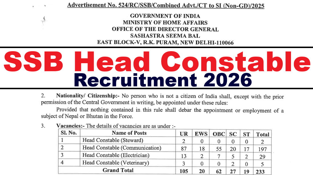 SSB Head Constable Recruitment 2026: सशस्त्र सीमा बल (SSB), जो कि Ministry of Home Affairs, Government of India के अंतर्गत आती है, ने Head Constable (Steward), Head Constable (Communication), Head Constable (Electrician) और Head Constable (Veterinary) के कुल 233 पदों पर भर्ती के लिए Online Applications आमंत्रित की हैं। SSB Head Constable Recruitment 2026 online form 20th April 2026 तक भरा जायेगा |