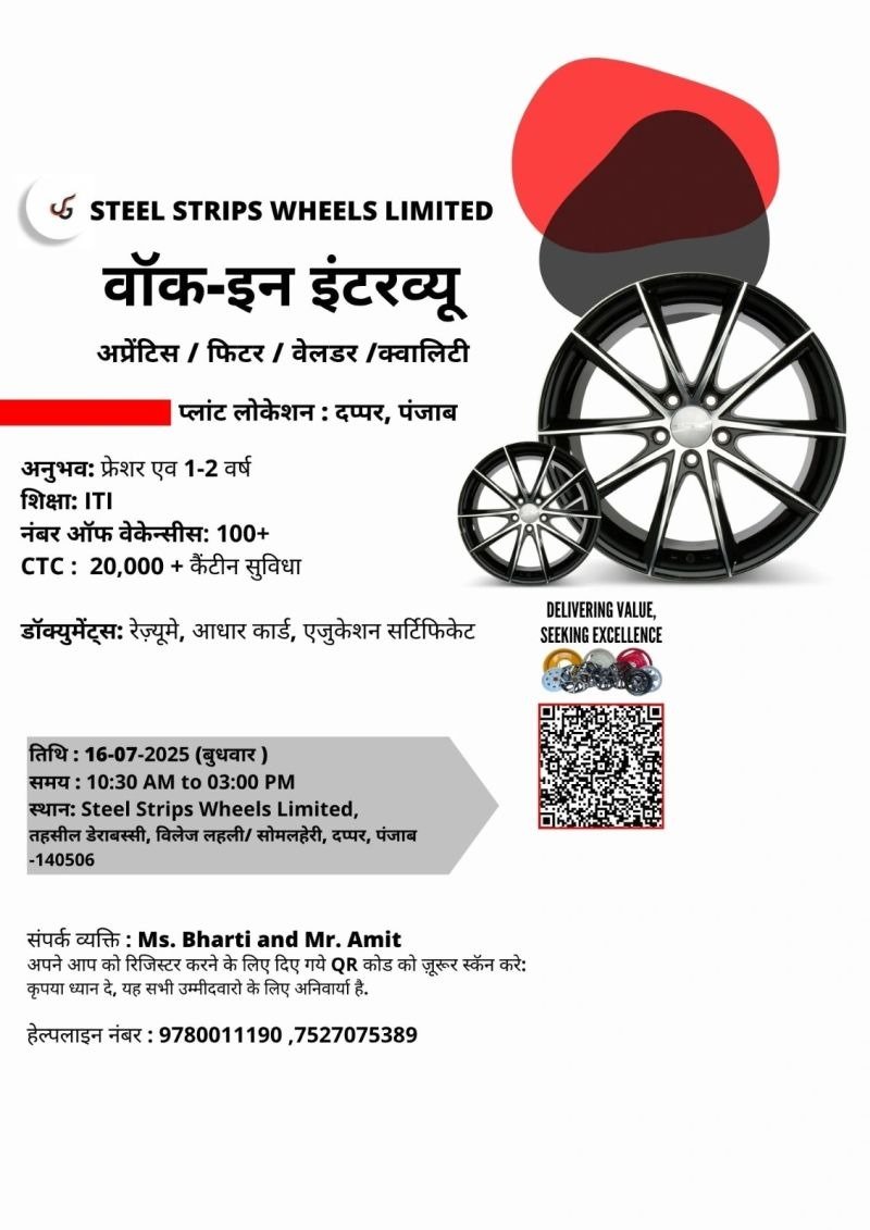 Steel Strips Wheels Recruitment 2025 : Steel Strips Wheels Limited की ओर से Electrician, Turner, Welder, Fitter & Machinist Posts पर Walk-In-Interview निकली है जिसका Interview Date 16 July 2025 , सुबह 10:30 बजे है|ITI Pass in various candidates Offline Walk-In-Interview में शामिल हो सकते हैI आपकी Walk-In-Interview Location – Steel Strips Wheels Limited, Taahsil Derabassi, Villlage Lahli/Somlaheri, Dappar, Punjab-140506 रहने वाला हैISteel Strips Wheels Walk-In-Interview 2025 Full Notification निचे दिया गया है |