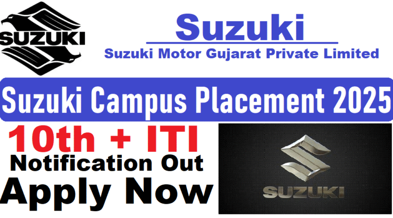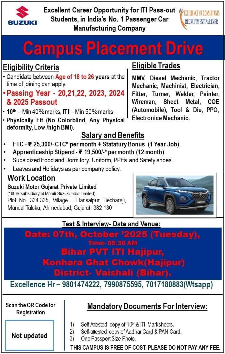 Suzuki Campus Placement 2025 : Suzuki Motor Gujarat Private Limited की ओर से Motor Mechanic, Diesel Mechanic, Tractor Mechanic, Machinist, Electrician, Fitter, Turner, Welder, Painter, Wireman, Sheet Metal, COE (Automobile), Electronic Mechanic, Tool & Die, PPO, Electronic Mechanic Posts पर Campus Placement निकली है जिसका Campus Date 07/10/2025 , सुबह 10:00 बजे है|ITI Pass in various candidates Offline Campus Placement में शामिल हो सकते हैI आपकी Campus Placement Location – Bihar PVT ITI Hajipur, Konhara Ghat Chowk (Hajipur) District- Vaishali (Bihar) रहने वाला हैI Maruti Suzuki Campus Placement 2025 Full Notification निचे दिया गया है |