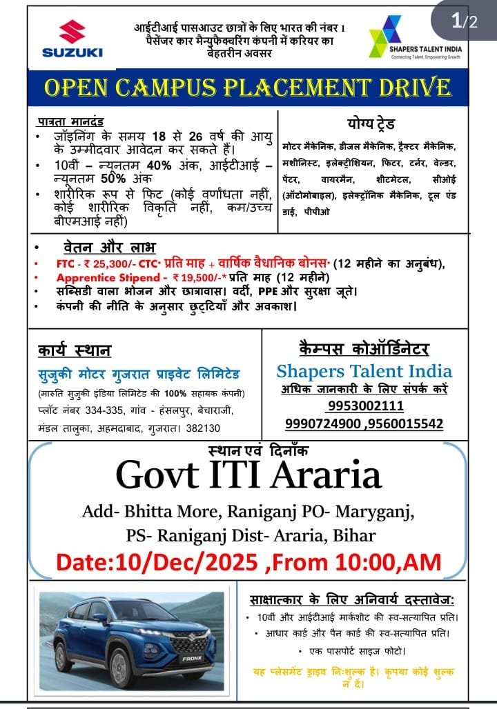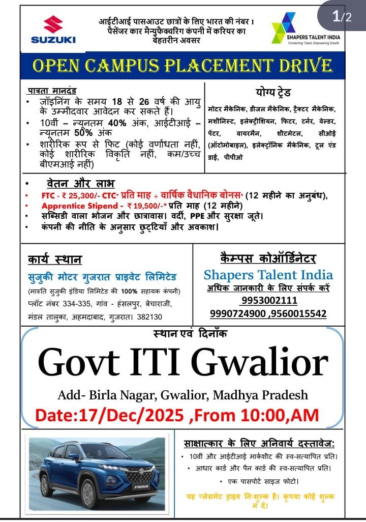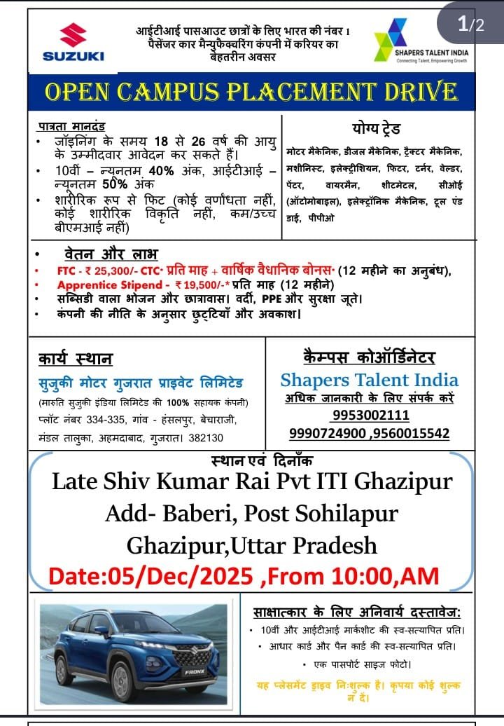 Suzuki Campus Placement 2025 : Suzuki Motor Gujrat Privet Limited की ओर से Motor Mechanic, Diesel Mechanic, Tractor Mechanic, Machinist, Electrician, Fitter, Turner, Welder, Painter, Wireman, Sheetmetal, COE (Automobile), Electronic Mechanic, Tool & Die, PPO Post पर Campus Placement निकली है जिसका Interview Date 04,05,10 &17 November 2025 , सुबह 10:00 बजे है|ITI Pass in various candidates Offline Campus Placement में शामिल हो सकते हैI आपकी Campus Placement Location नीचे दिया गया हैI Suzuki Campus Placement 2025 Full Notification निचे दिया गया है |