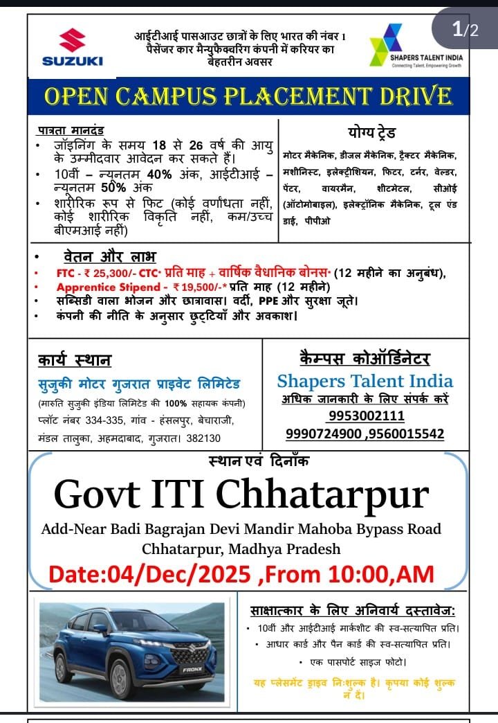 Recruitment Organization Suzuki Motor Gujrat Privet LimitedRecruitment Type Campus Placement Total Posts Not Disclosed Application Mode Offline Interview Date 04,05,10 &17 November 2025 Reporting Time 10:00 Am Qualification ITI Pass Know More Click Here Join Telegram Join Telegram Download App Click Here