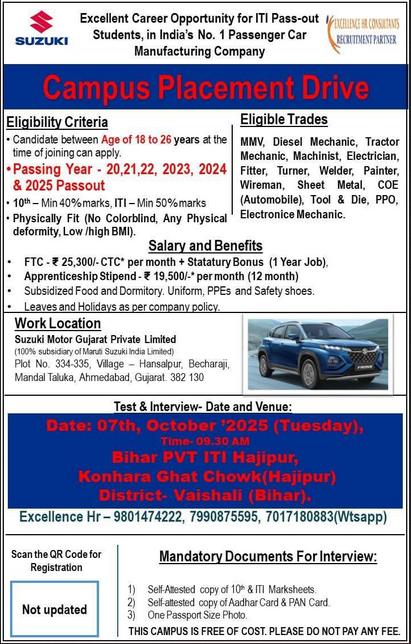 Suzuki Motor Campus Placement 2025 : Suzuki Motor Gujarat Private Limited की ओर से MMV, Diesel Mechanic, Tractor Mechanic, Machinist, Electrician, Fitter, Turner, Welder, Painter, Wireman, Sheet Metal, COE (Automobile), Tool & Die, PPO, Electronice Mechanic Post पर Campus Placement निकली है जिसका Campus Date 06 & 07 October 2025 , सुबह 09:30 बजे है|ITI Pass in various candidates Offline Campus Placement में शामिल हो सकते हैI आपकी Campus Placement Location – नीचे दिया गया हैI Suzuki Motor Campus Placement 2025 Full Notification निचे दिया गया है |