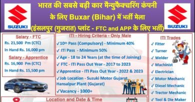 Suzuki Motor Gujarat Plant recruitment 2022: Suzuki Motor Gujarat Plant की तरफ से ITI Pass candidates के लिए Apprentice और FTC के लिए recruitment निकली है और campus Placement होने जा रहा है। Suzuki Motor का campus Bihar और uttar Pradesh के छात्रों के लिए होगा ।