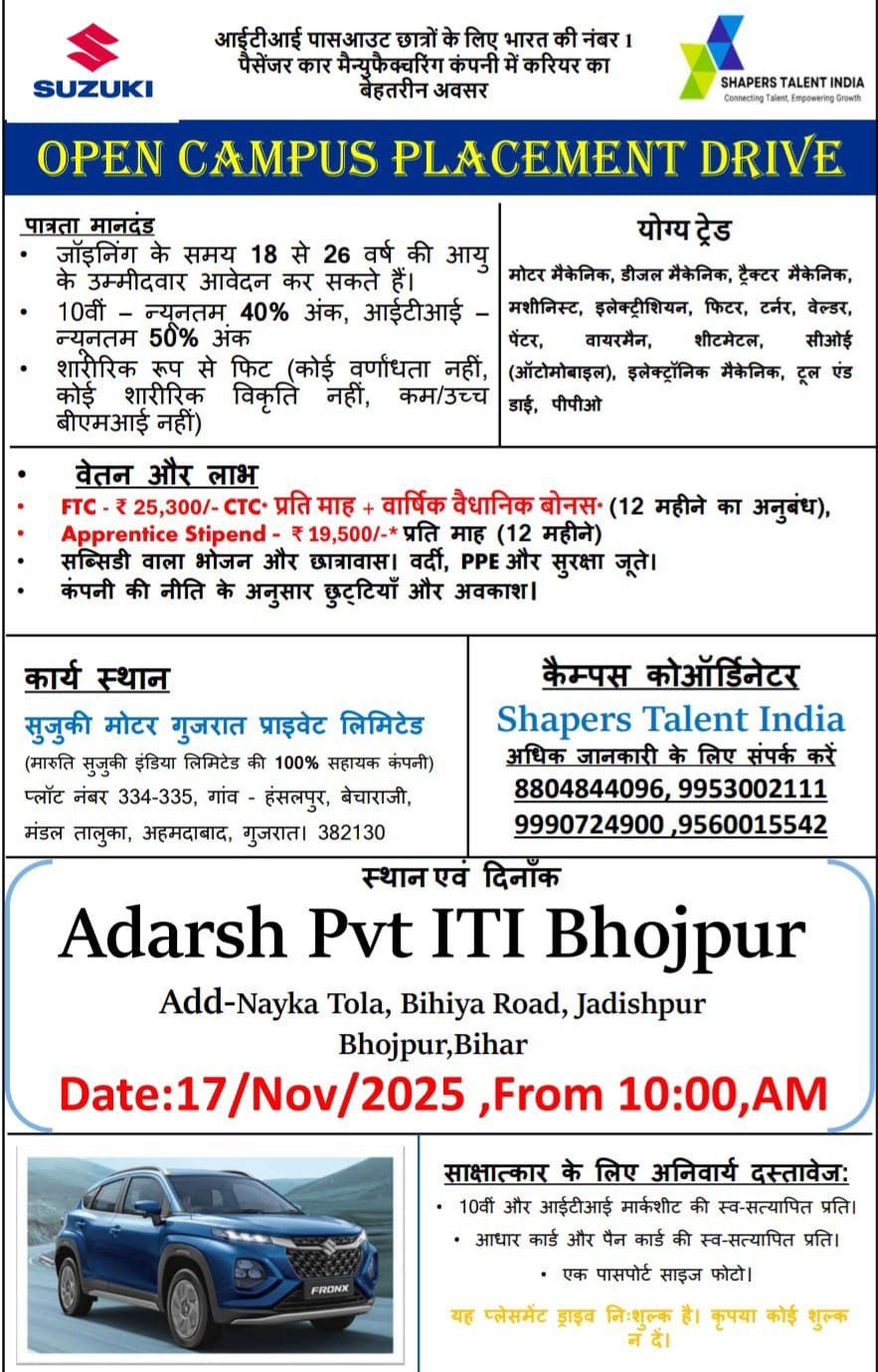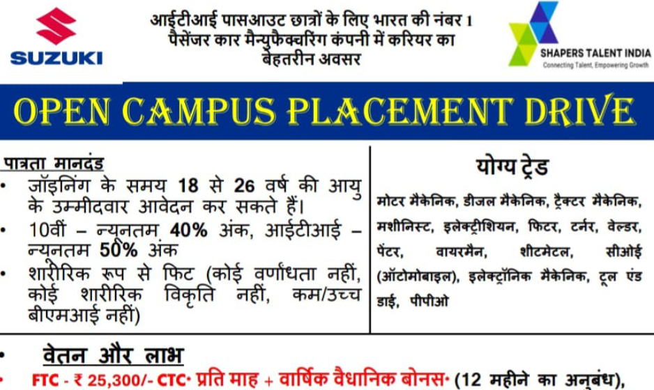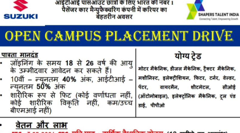 Suzuki Motor ITI Campus Placement 2025: Suzuki Motor की ओर से ITI Pass Candidates के लिए Apprentice, FTC Posts पर Recruitment के लिए Campus Placement होने जा रहा है | Suzuki Motor Campus Placement की जानकारी निचे दी गयी है | Suzuki Motor में ITI Pass Various Trades के लिए Campus Placement हो रहा है | अगर आप Apprentice Join कर सकते हैं या FTC दोनों जिसके लिए आप इच्छुक हो अ eligible है |