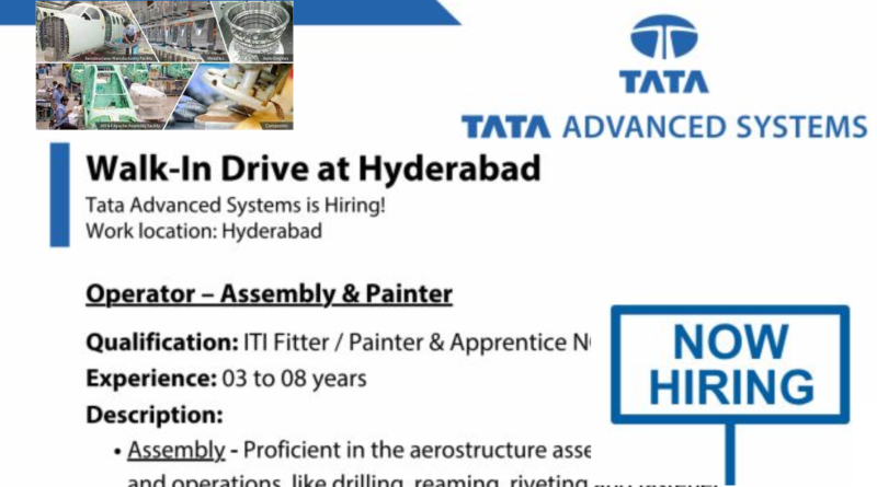 Tata Advanced Systems Recruitment 2024: ITI Pass Fitter, Painter Candidates के लिए Tata Advanced Systems Hyderabad की ओर से Operator Assembly & Painter के लिए Recruitment निकली है | Tata Advanced Systems Recruitment 2024 Work Location Hyderabad में होने वाला है | Tata Advanced Systems Recruitment 2024 Selection Walk in Interview के माध्यम से होने वाला है | Tata Advanced Systems Recruitment 2024 की जानकारी निचे दी गई है |