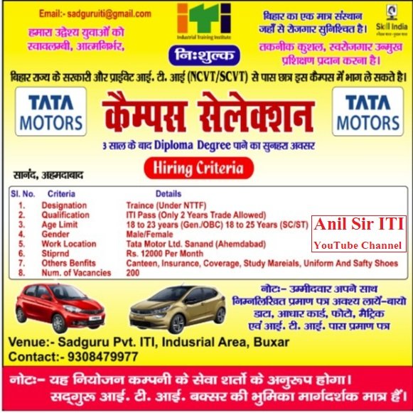 Tata Motor Jamshedpur Jharkhand के लिए बिहार के एक आईटीआई में कैंपस सिलेक्शन के लिए आ रही जिसमे 200 छात्रो का चयन किया जायेगा | Tata Motor समय समय पर आईटीआई के छात्रो के लिए भारत के विभिन्न राज्यों के आईटीआई में से कैंपस कराकर अपने प्रोडक्शन unit में रखती है | इससे आईटीआई के छात्रो को Tata Motor में काम करने का अच्छा मौका भी मिलता है |