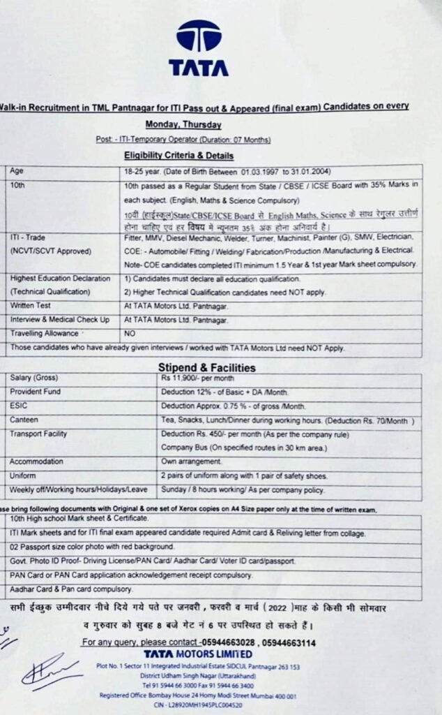 | Interview & Medical Check up | At TATA Motors Ltd Pantnagar |