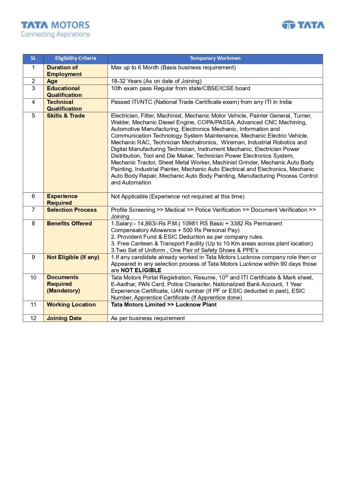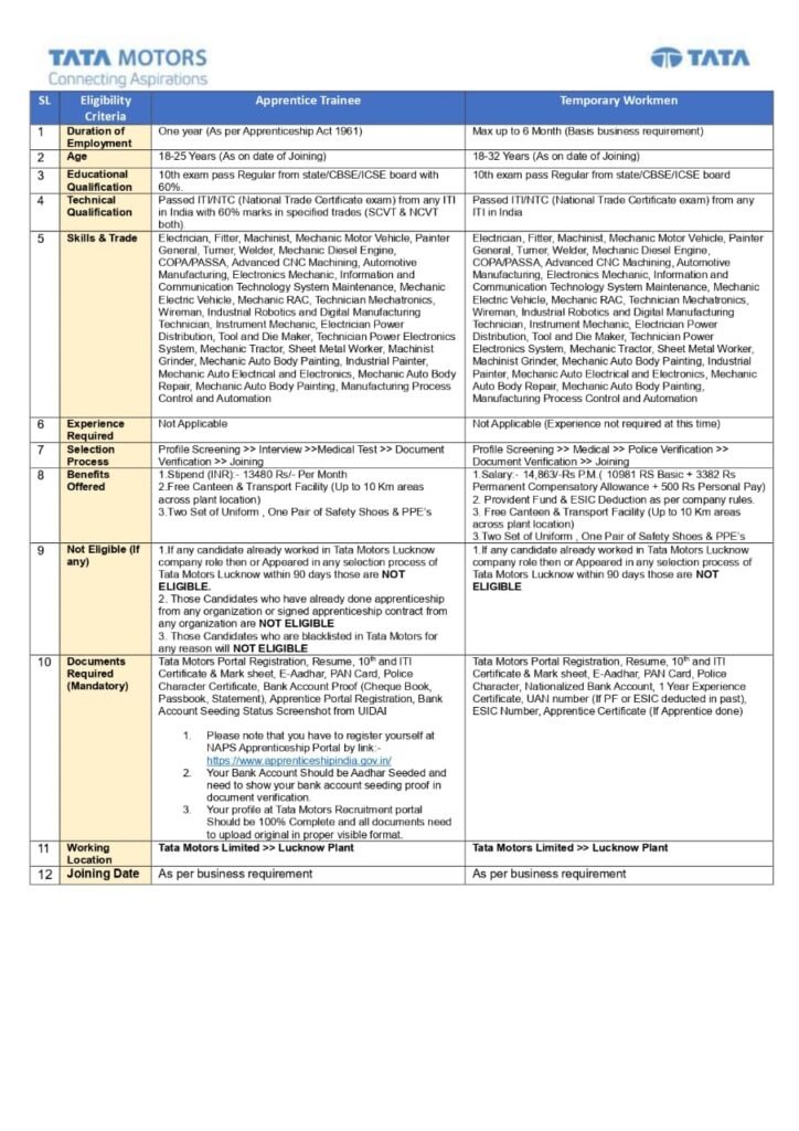 Not Eligible : Candidates who have participated in any Tata Motors Lucknow selection process within the last 90 days. Previously held an Apprentice/Job Trainee/NEEM/NAPS position at Tata Motors Lucknow.