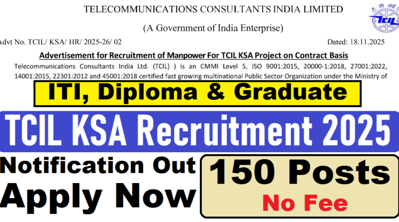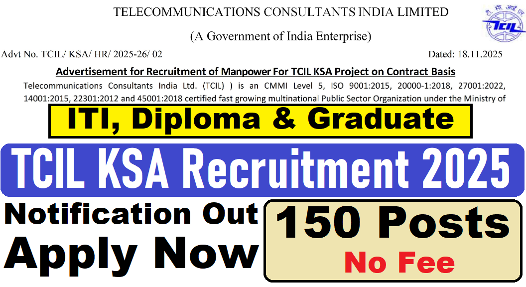 TCIL KSA Recruitment 2025 : Telecommunication Consultants India Ltd. (TCIL) की ओर से 150 Posts पर Recruitment निकली है जिसका Online form 18/11/2025 से शुरू है | TCIL KSA Recruitment 2025 Online form 09/12/2025 तक भरा जायेगा | ITI, Diploma & Graduate Pass in various candidates TCIL KSA Recruitment 2025 online form भर सकता है | Interested and eligible candidates TCIL KSA Recruitment 2025 form भर सकते हैं | TCIL KSA Recruitment Full Notification निचे दिया गया हैI TCIL KSA Recruitment Apply Link (Via E-mail) निचे दिया गया है I