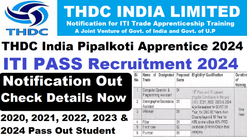 THDC India Pipalkoti Apprentice Recruitment 2025 : Tehari Hydro Development Corporation Limited की ओर से 10 Post पर Apprenticeship निकली है जिसका form भरना शुरू होगा | ITI Pass Fitter, Electrician, Plumber , Wireman, Stenographer/Secretarial Assistant Computer Operator& programming Assistant etc Trade Pass candidates इस THDC India Pipalkoti Apprentice Recruitment 2025 में शामिल हो सकते है I आपकी Apply Address assistant manager Vishnugad- Pipalkoti Hydro Electric Project, (VPHEP) Alaknanda Puram, Siyasain, Pipalkoti Distt- Chamoii -246472 रहने वाला है I THDC India Pipalkoti Apprentice Recruitment 2024 की जानकारी निचे दी गई है |THDC India Pipalkoti Apprentice Recruitment 2024 का Notification Link निचे दिया गया है I THDC India Pipalkoti Apprentice Recruitment 2024 का Official Website Link निचे दिया गया है |