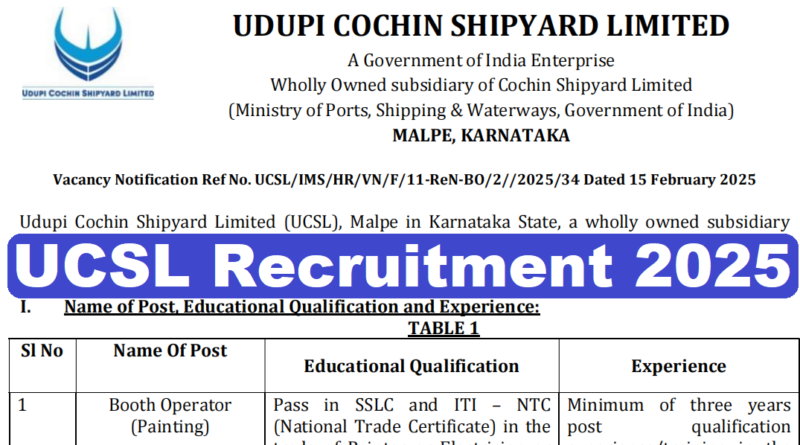 UCSL Recruitment 2025 : Udupi Cochin Shipyard Limited (UCSL) की ओर से 02 Posts पर Recruitment निकली है जिसका Online form 15/02/2025 से शुरू हैI UCSL Recruitment 2025 Online form 17/03/2025 तक भरा जायेगा |ITI Pass in various candidates UCSL Recruitment 2025 online form भर सकता है | Interested and eligible candidates UCSL Recruitment form भर सकते हैं |UCSL Recruitment Full Notification निचे दिया गया हैI UCSL Recruitment 2025 Apply Link निचे दिया गया है I
