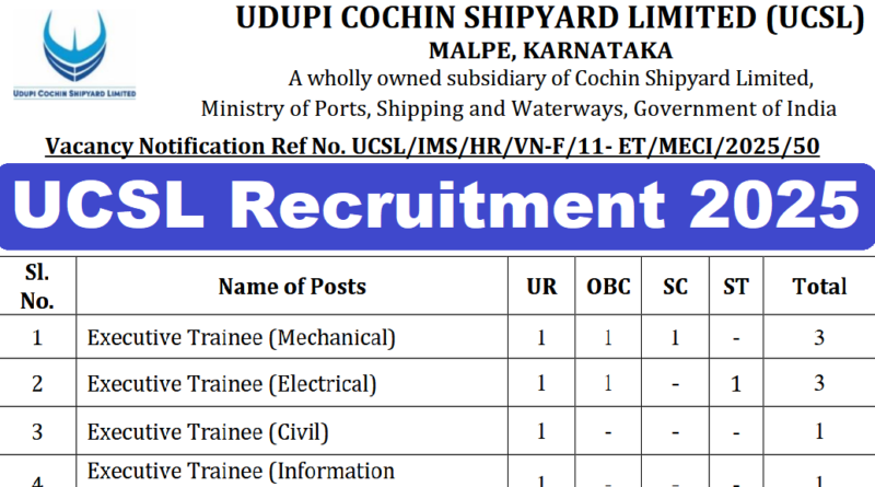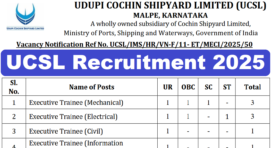 UCSL Recruitment 2025 : Udupi Cochin Shipyard Limited (UCSL) की ओर से 08 Posts पर Recruitment निकली है जिसका Online form 21/07/2025 से शुरू है | UCSL Recruitment 2025 Online form 20/08/2025 तक भरा जायेगा | B.E./B.Tech Pass in various candidates UCSL Recruitment 2025 online form भर सकता है | Interested and eligible candidates UCSL Recruitment 2025 form भर सकते हैं |UCSL Recruitment Full Notification निचे दिया गया हैI UCSL Recruitment Apply Link निचे दिया गया है I