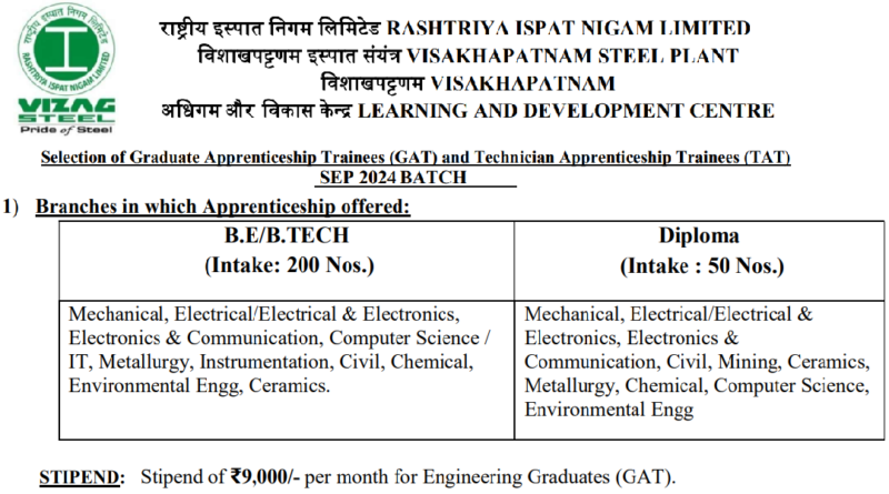 RINL VSP Steel Apprentice Recruitment 2024: RINL-VSP is inviting applications for Graduate and Technician Apprenticeship Trainees from the Engineering and Diploma Passed out candidates (Passed in 2021/2022/2023/2024 only) in the branches mentioned below. The period of apprenticeship training is one year. This is not a regular vacancy and shall be relieved on completion of one year apprenticeship training under the Apprentices (Amendment) Act 1973. It shall not be obligatory on the part of RINL-VSP to offer any employment on completion of apprenticeship training. VIZAG Steel Apprentice Online form apply before 31-09-2024.