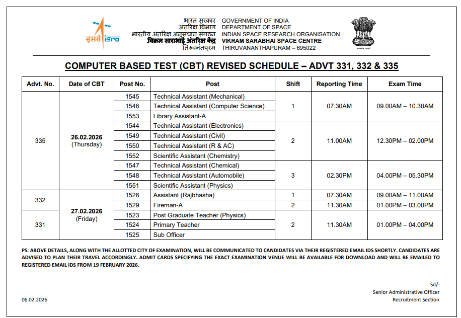 VSSC Recruitment Exam Schedule 2026: VSSC (Vikram Sarabhai Space Center released Comuter based test for the posts of Technical Assistant, Scientifica Assistant, Library Assistant, Assistant Rajbhasha, Fireman A, Post Gradaute Teacher, Primary Teacher, Sub Officer. Not yet released VSSC Technician b Exam Schedule. Wait Some days VSSC release soon Technician B Exam Schedule. VSSC Release only ADVT no 331,332 & 335 Vacancy Exam Schedule.