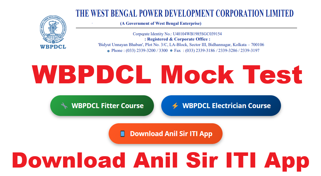 WBPDCL Electrician, Fitter Mock Test 2025: West Bengal Power Development Corporation Limited invite application for the Posts of Fitter, Electrician Operator and Technician Posts. WBPDCL Operator Technician Recruitment 2025 online form apply before 13.10.2025. WBPDCL Recruitment 2025 Electrician, Fitter candidates take online form mock test on Anil Sir ITI Application. WBPDCL Electrician, Fitter Full Mock Test, Section Mock Test Topic wise test pdf given in Anil Sir ITI Application.