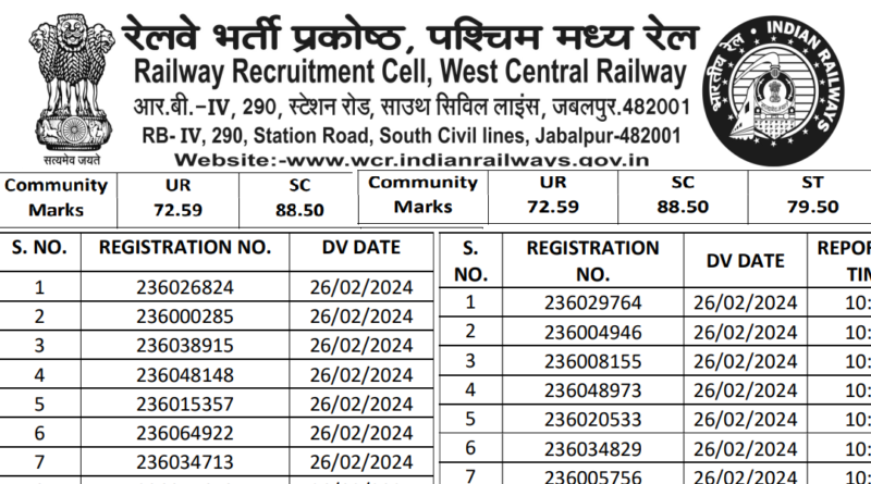 - उपरोक्त उम्मीदवारों को सूचित किया जाता है कि वे दस्तावेज सत्यापन के लिए उल्लेखित तिथि एवं समय पर रेलवे भर्ती प्रकोष्ठ कार्यालय, पश्चिम मध्य रेल, जबलपुर में उपस्थित हों। उम्मीदवारों को बुलावा पत्र (ई-कॉल लेटर) डाउनलोड करने की लिंक पश्चिम मध्य रेल की आधिकारिक वेबसाइट www.wcr.indianrailway.gov.in पर शीघ्र ही उपलब्ध करायी जायेगी।