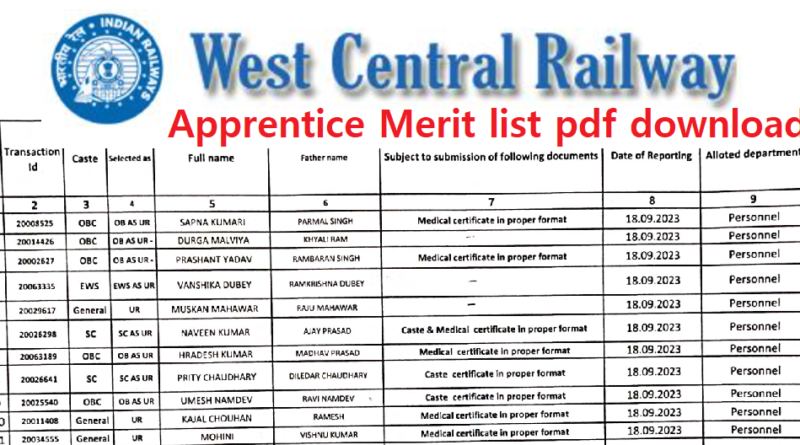 WCR Bhopal Apprentice 2023 Final Merit list, ITI Pass Railway Apprentice Update