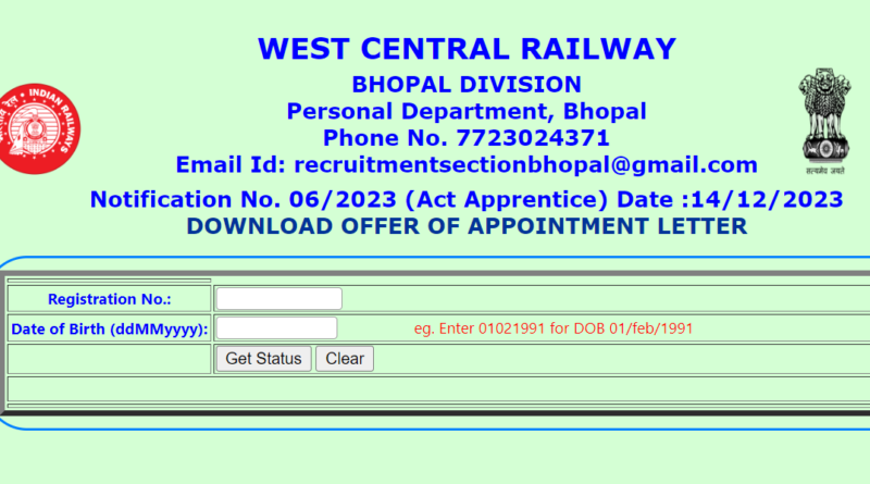 WCR Bhopal Apprentice Final Merit list, Call letter out 2024
