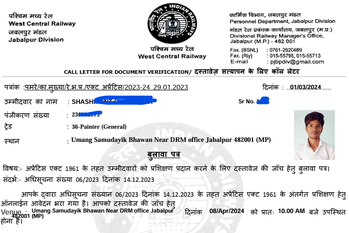 WCR Railway Apprentice Call letter 2024: West Central Railway Jabalpur की ओर से ITI Pass Candidates के लिए 3015 Posts पर Apprentice निकली थी जिसका document verification का merit list जारी कर दिया गया है और आज WCR Jabalpus Apprentice 2024 Call letter जारी कर दिया गया है | RRC WCR Jabalpur Apprentice Call letter 2024 download link निचे दी गई है |