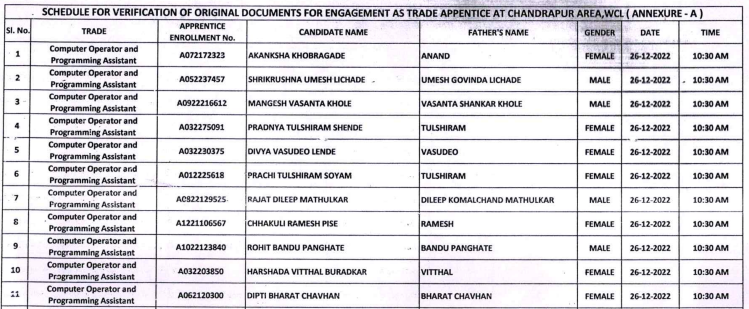 Western Coalfields Limited Apprenticeship merit list 2022: WCL की Apprentice निकली थी जिसमे 10th, ITI, Diploma, Graduate candidates के लिए Apprentice निकली थी | जिसका Online form 22-11-2022 तक भरा गया था | WCL Apprentice का document verification शुरू है |अभी WCL Chandrapur का document verification merit list जारी हो गया है | WCL Chandrapur Apprentice document verification 26-12-2022 से 02-01-2023 होने वाला है |