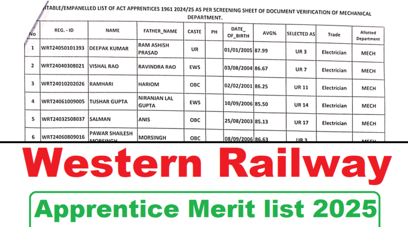 Western Railway Pratap Nagar Apprentice Merit list 2025 out