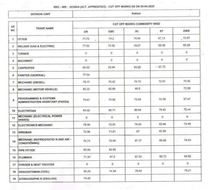 Western Railway Ratlam Apprentice Cut off 2025 : Western Railway की ओर से ITI Pass Candidates के लिए 5066 Posts पर Apprenticeship निकली है जिसका Online form 23/09/2024 से भरना शुरू हुआ था| Western Railway Ratlam Apprentice online form 23/12/2024 तक भरा गया| ITI Pass Candidates को Railway में 1 साल के लिए Apprentice Training का मौका मिलगा | ITI Pass Western Railway, Electrician, Fitter,Welder, Carpenter, Painter, Machinist, Turner, PASSA, Refrigeration & AC Mechanic, Draftsman (Civil), Stenographer (English) etc trade online form भरे थे|Western Railway Ratlam Apprentice 2024 की 31/12/2024 को Ratlam Merit list जारी हुआ था | Western Railway Ratlam Apprentice Document Verification Merit list जारी कर दिया गया है साथ में Western Railway Ratlam Apprentice Cut off 2024-25 भी जारी कर दिया गया है | Western Railway Ratlam Apprentice Railway Apprentice Cut off PDF निचे दी गई है |