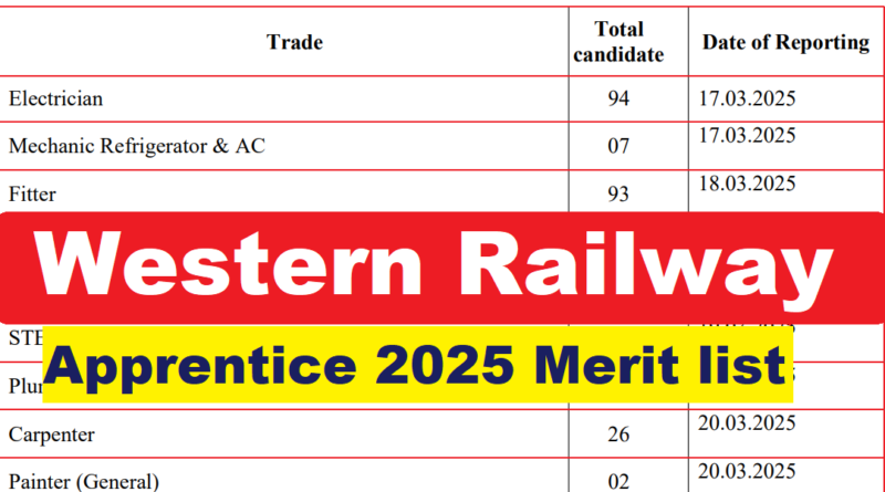 Western Railway Ratlam Apprentice Merit list 2025: Western Railway की ओर से ITI Pass various trades candidates के लिए Apprentice निकली थी जिसका Online form 23-09-2024 से भरना शुरू हुआ था | Western Railway Ratlam Division Apprentice Document Verification merit list 31-12-2024 को जारी कर दिया गया था | RRC WR Ratlam Apprentice Document Verification 16-01-2025 से 21-01-2025 तक होने के बाद आज Joining के लिए Merit list जारी कर दिया गया है | RRC WR Ratlam Apprentice Joining 17-03-2025 से 21-03-2025 तक होने वाला है |
