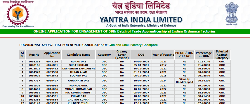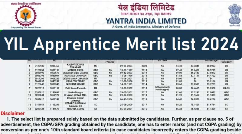 Yantra India Limited Apprentice Merit list 2024 Result out, YIL Apprentice Cut off 2024